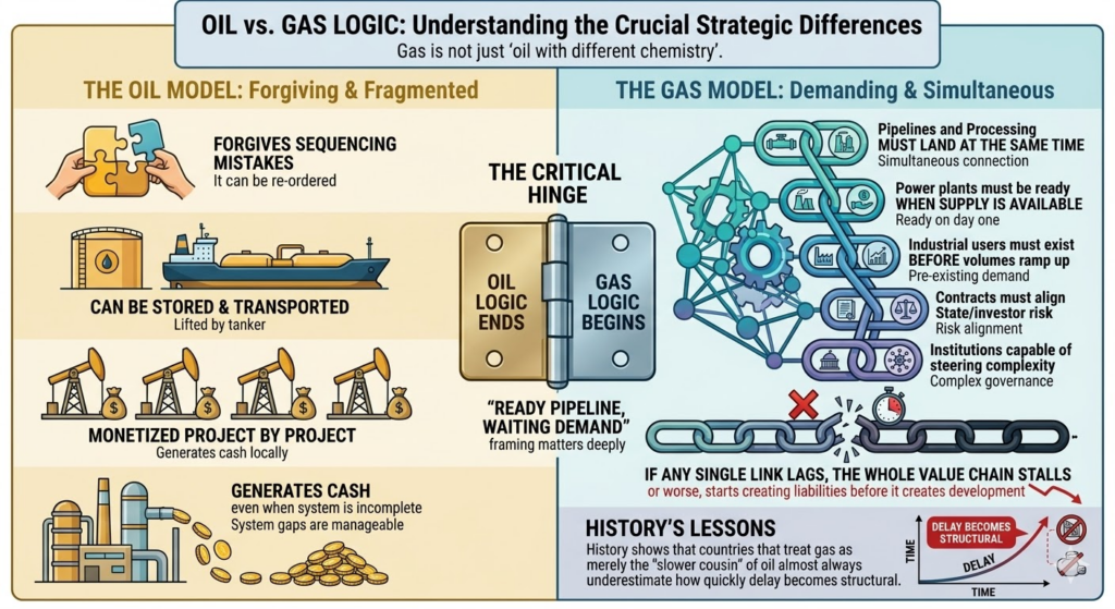 Oil forgives sequencing mistakes. It can be stored, lifted by tanker, monetised project by project, and generates cash even when the rest of the system is incomplete.