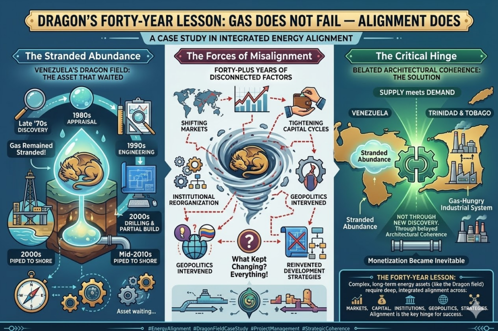 The Dragon field offshore Venezuela was not a geological disappointment. Discovered in the late 1970s, appraised in the 1980s, engineered in the 1990s, drilled and partially built in the 2000s, and nearly piped to shore by the mid‑2010s, the gas remained exactly where it had always been.