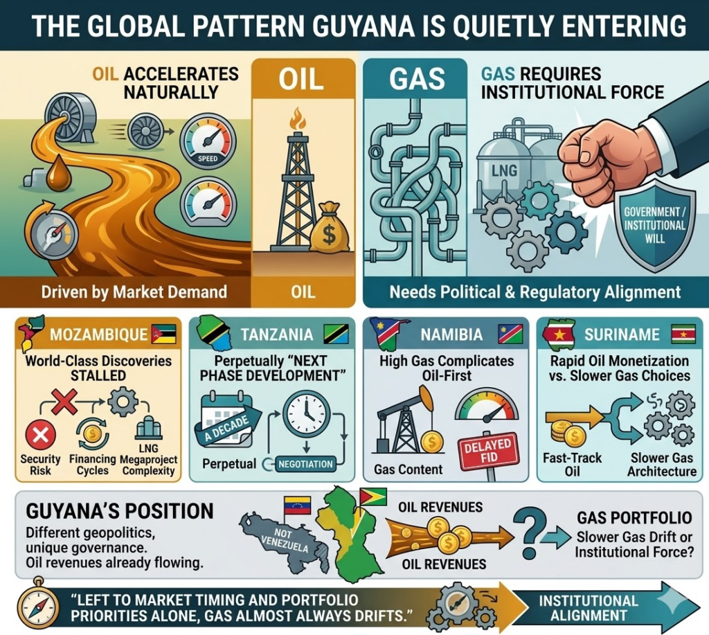 Across the world, major gas provinces follow a familiar rhythm: oil accelerates naturally, gas only moves when institutions force alignment.