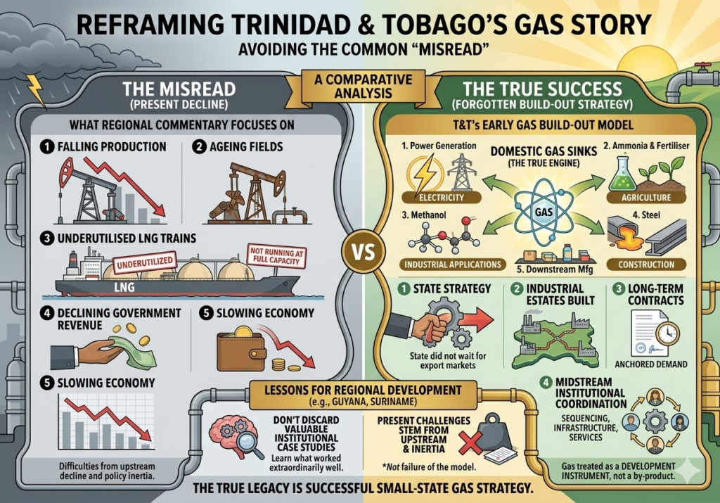 Much regional commentary focuses on Trinidad and Tobago’s recent gas decline – falling production, ageing fields, underutilised LNG trains, declining government revenue, slowing economy. What is often forgotten is that Trinidad’s early gas build‑out phase was one of the most successful examples of small‑state industrial gas strategy anywhere in the developing world.