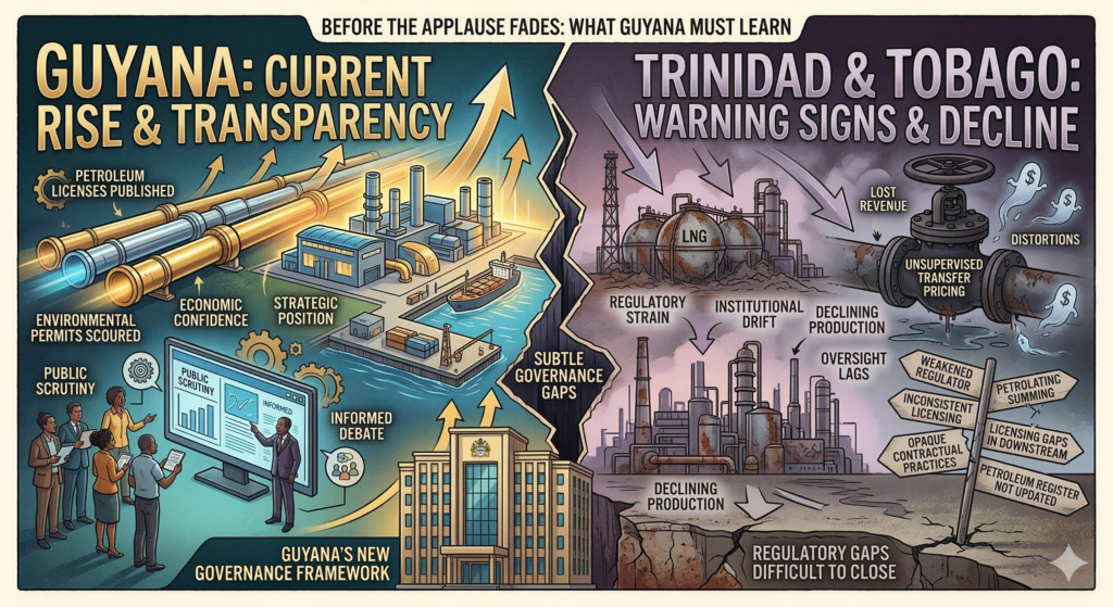 Trinidad and Tobago once stood where Guyana stands now: confident, cash-rich, strategically positioned, and widely praised for transforming offshore discoveries into industrial growth. Petrochemical complexes expanded, LNG exports flourished, and the country became a regional energy anchor. Yet over time, beneath the headline successes, regulatory strain, licensing inconsistencies, institutional under-resourcing and opaque contractual practices began to accumulate. The consequences were not immediate. They were incremental. And that is precisely why they matter.